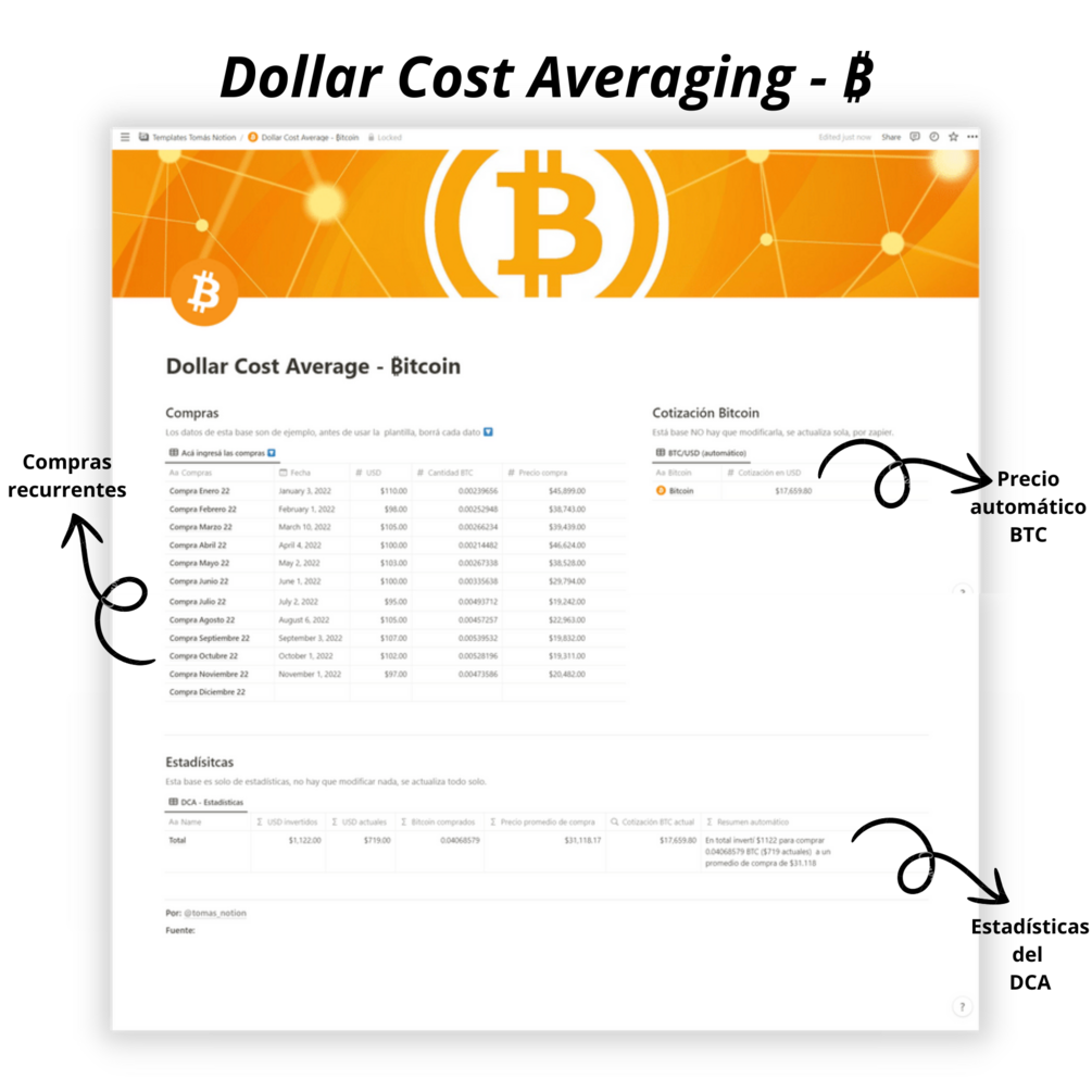 Template para hacer DCA de Bitcoin e intrucciones para tener la cotización de BTC en notion